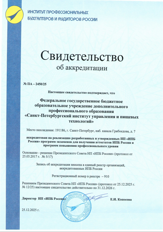 ФГБОУ ДПО СПИУПТ является корпоративным членом Института профессиональных бухгалтеров и аудиторов России и внесен в единый реестр организаций аккредитованных ИПБ России.